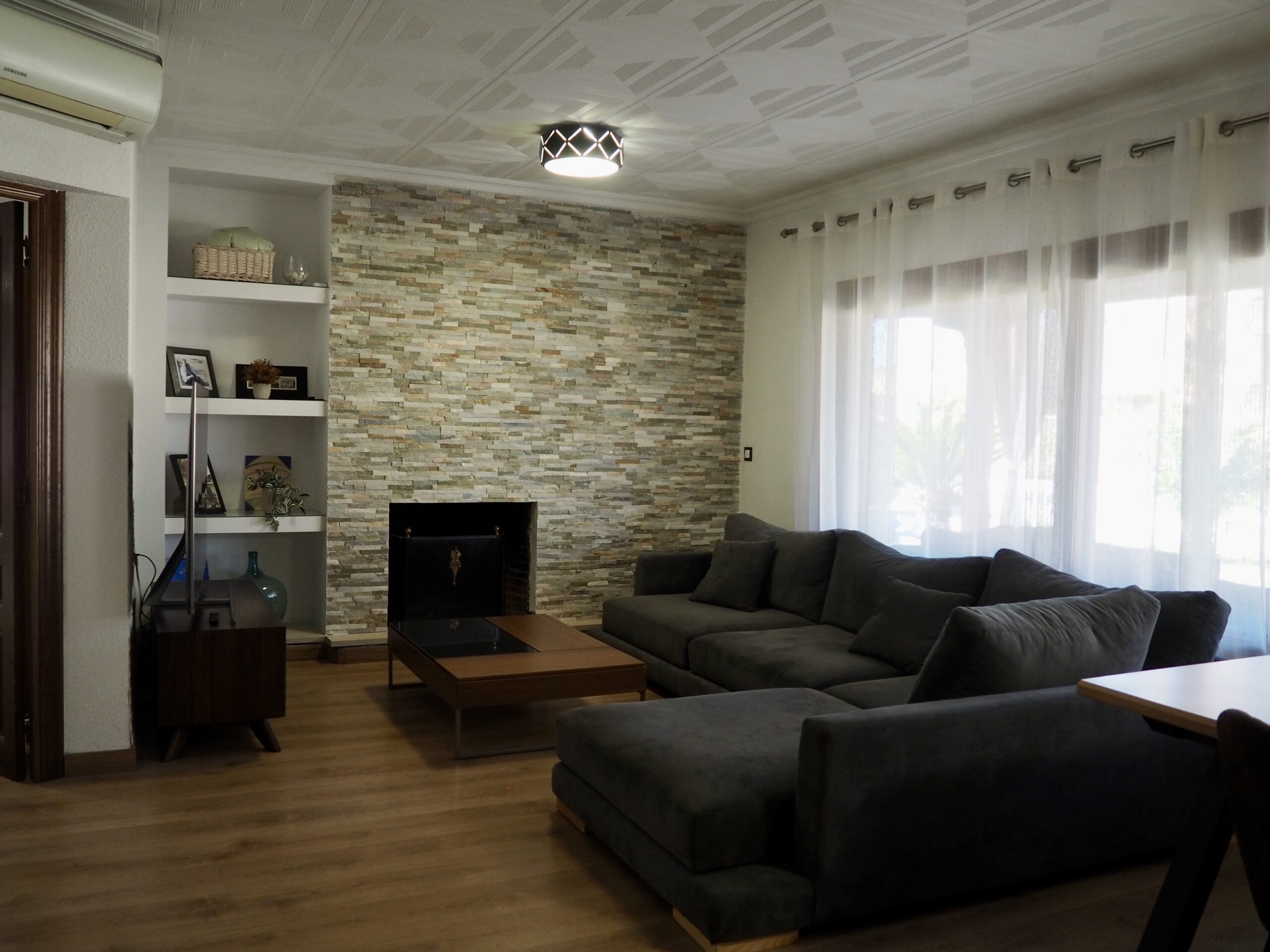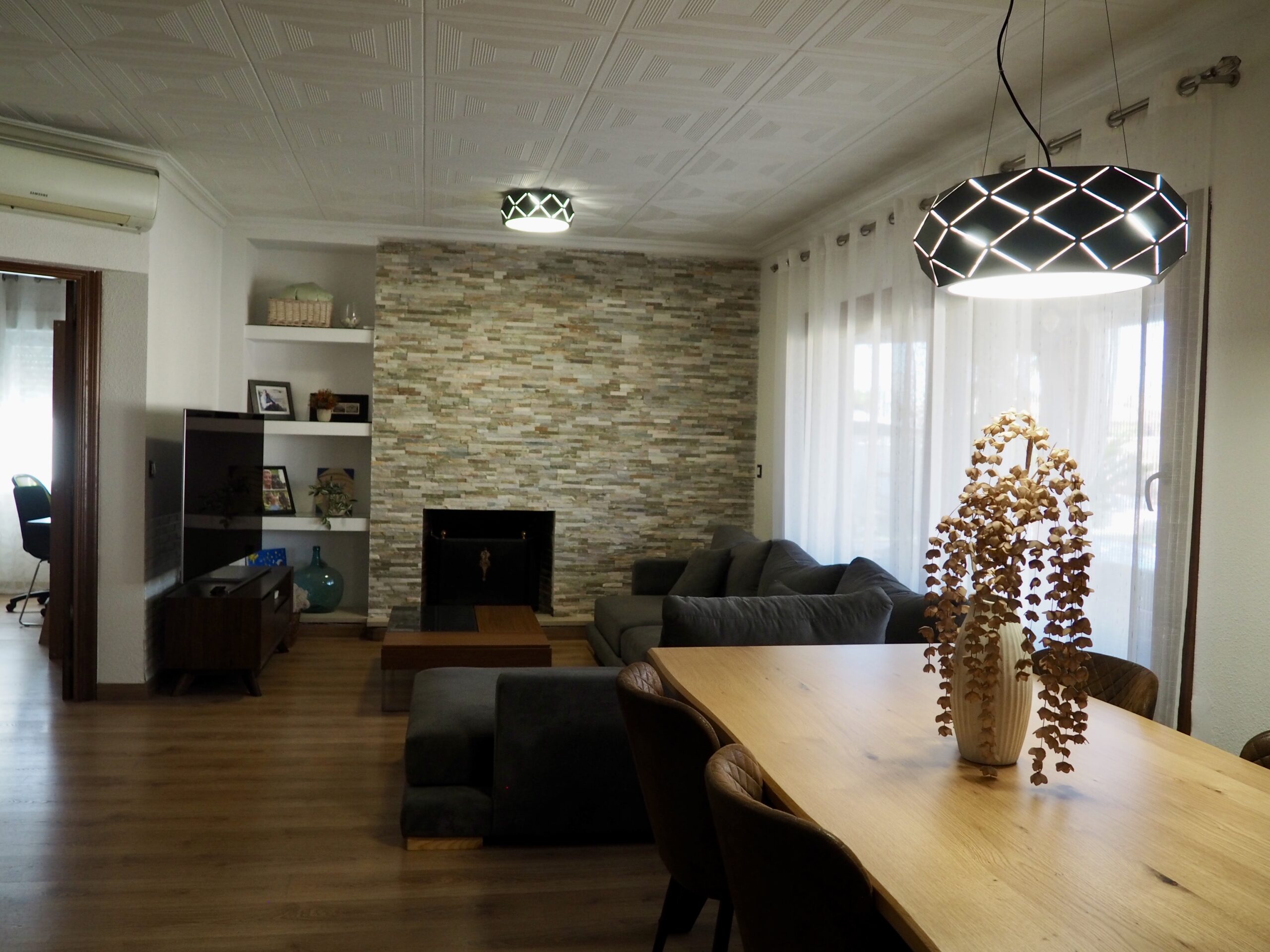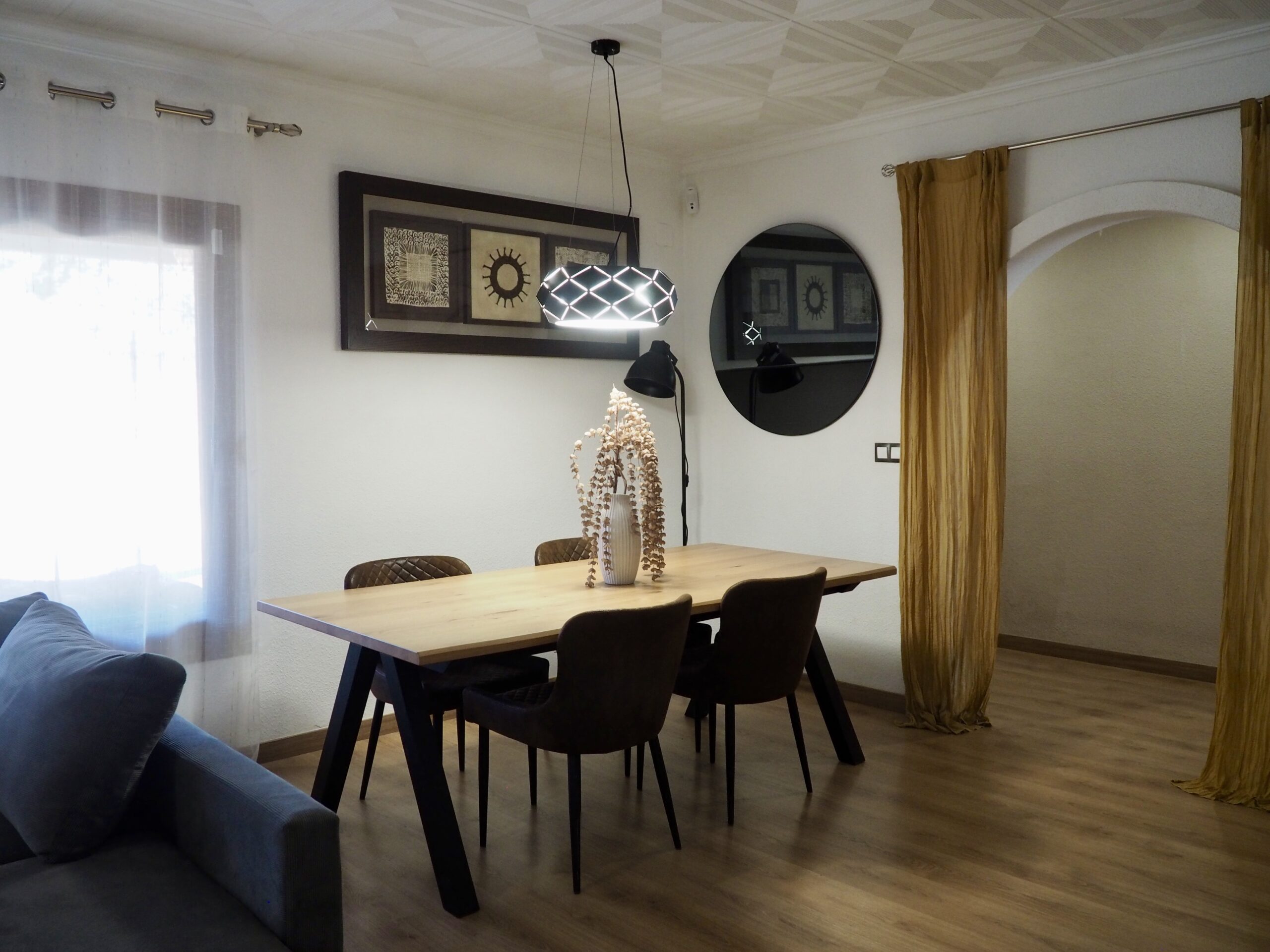 El chalet dispone de 3 dormitorios amplios más un cuarto dormitorio actualmente utilizado como vestidor, 1 baño completo, 1 aseo interior y 1 baño exterior. El salón es luminoso e incluye chimenea renovada en 2023, y la cocina, también reformada ese mismo año, cuenta con despensa independiente y armarios de cierre suave.