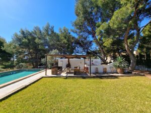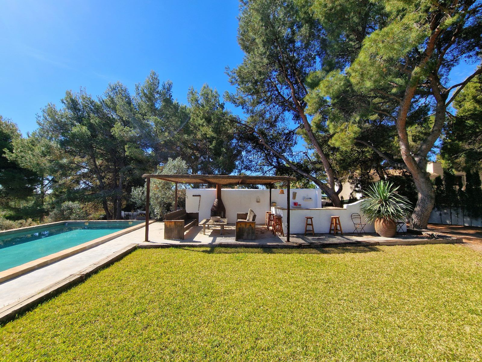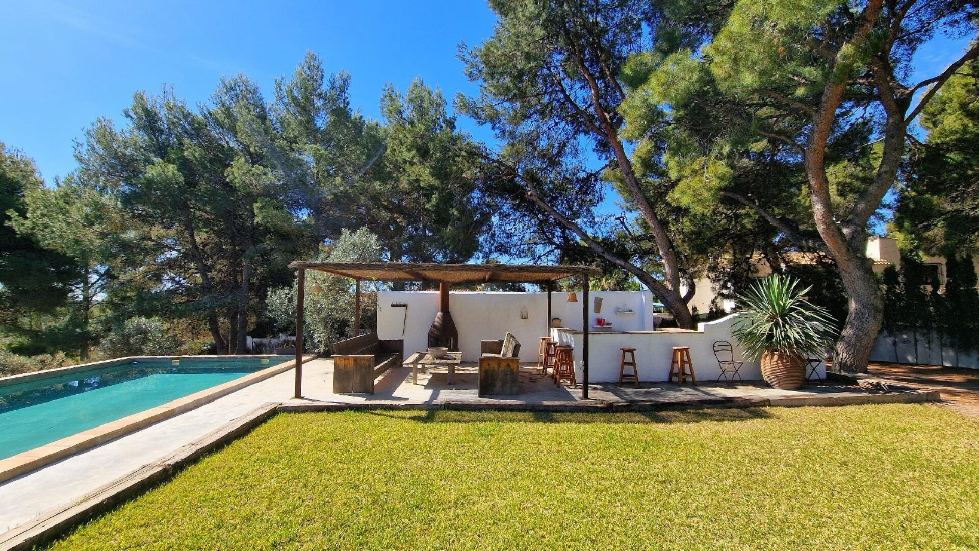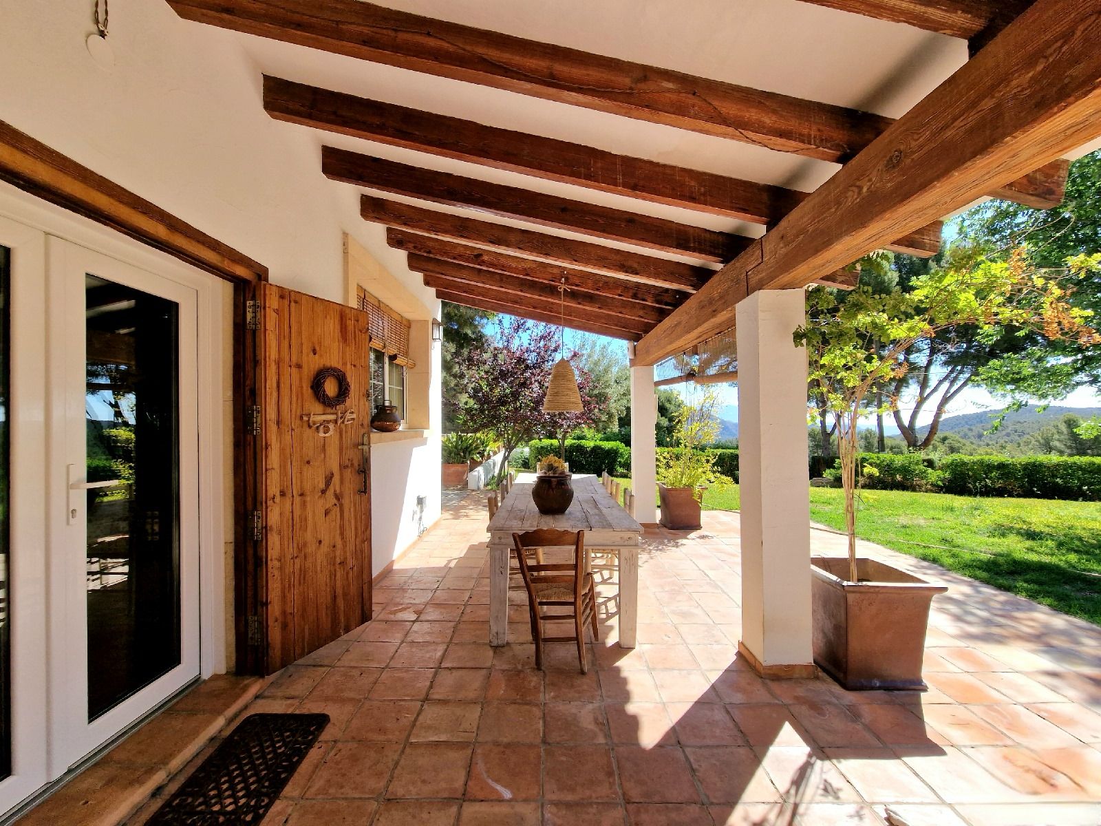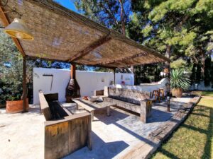 El porche principal, con su chimenea de obra estilo ibicenco y suelos de barro artesanal, se convierte en el rincón perfecto para relajarte o recibir invitados en cualquier época del año.