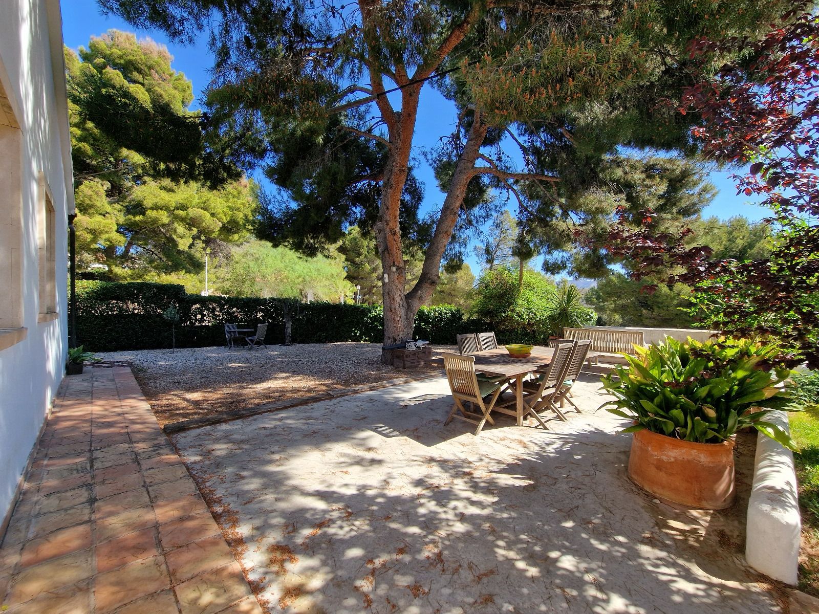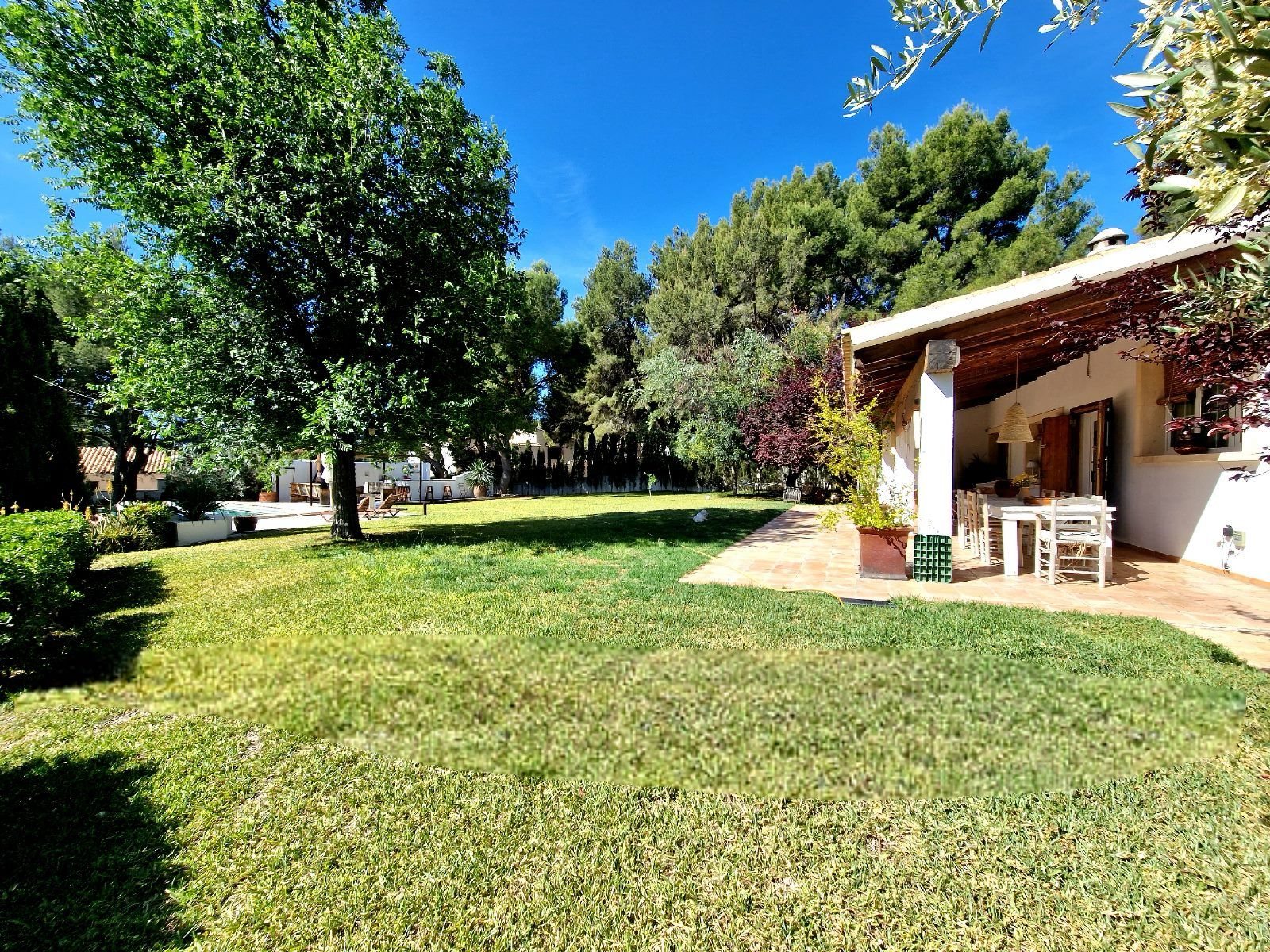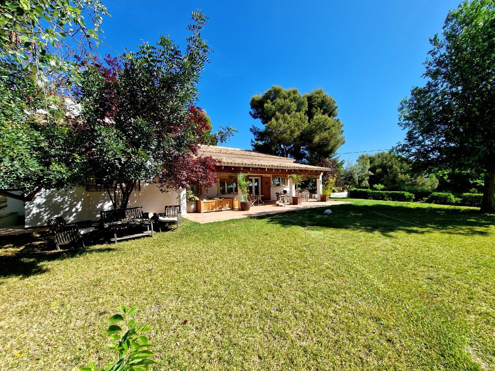 El jardín, con más de 1.500 m², combina belleza, funcionalidad y sostenibilidad. Césped natural con riego automático independiente del suministro municipal (gracias al pozo comunitario de la urbanización), árboles de gran porte y zonas de sombra cuidadosamente distribuidas.
