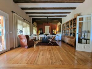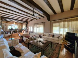 En la planta principal, la vivienda sorprende por sus techos altos con vigas de mobila, el salón con chimenea de piedra arenisca de Jávea y una distribución fluida, acogedora y luminosa.